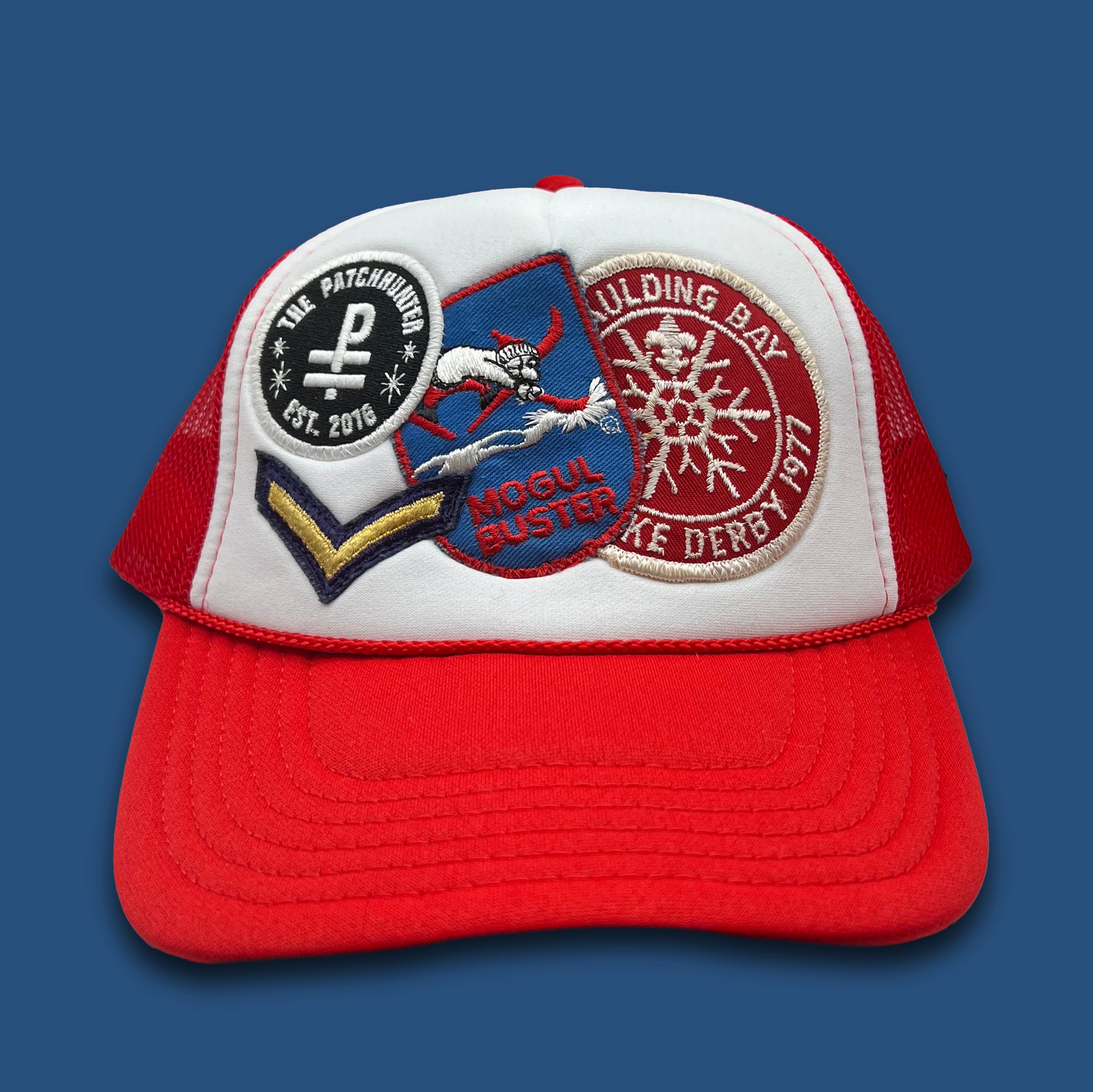 A red and white trucker hat with mix of custom ski themed patches, snap back closure.