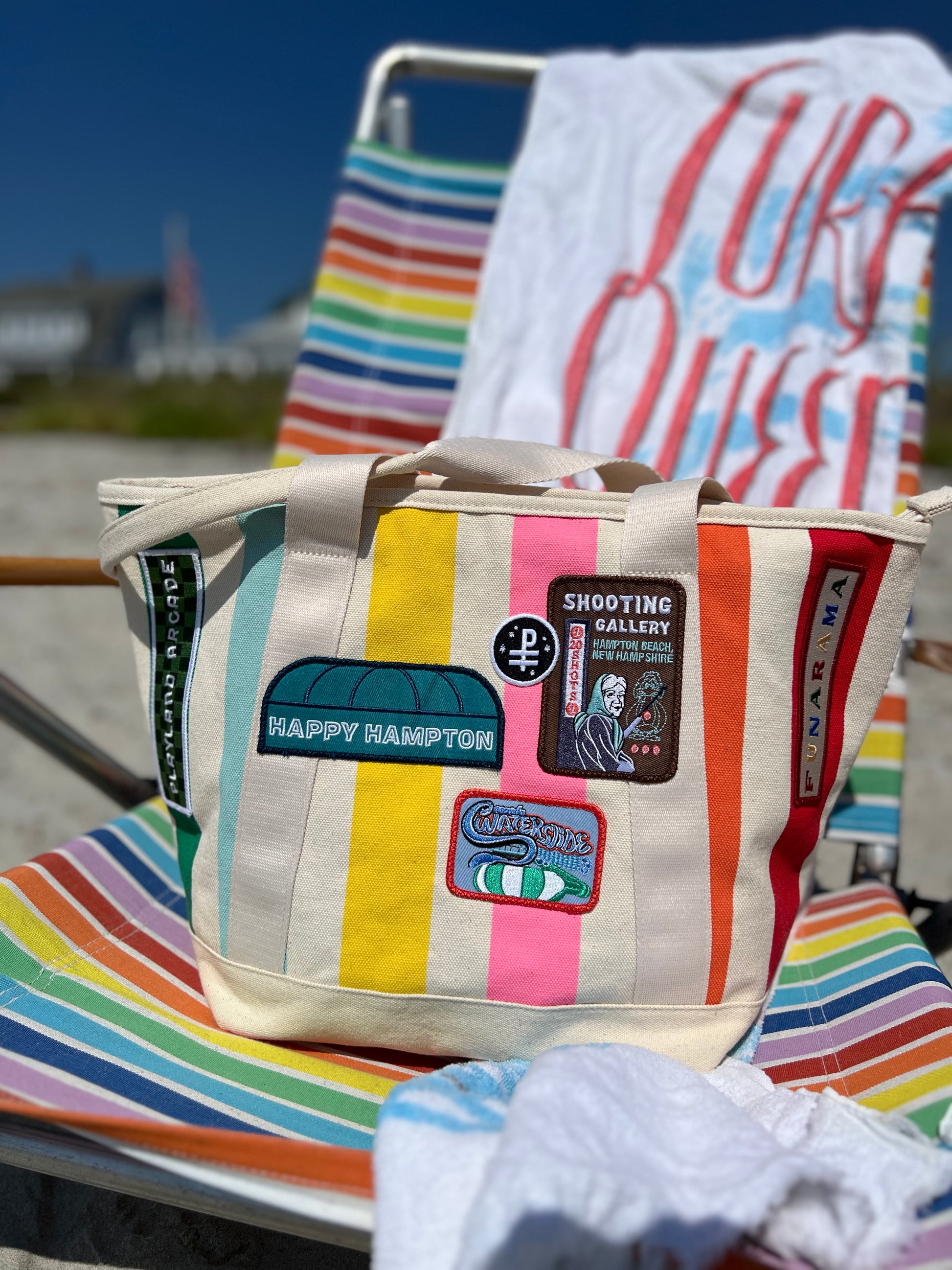 Tote bag created with authentic vintage Hampton Beach pennant and various other patches.