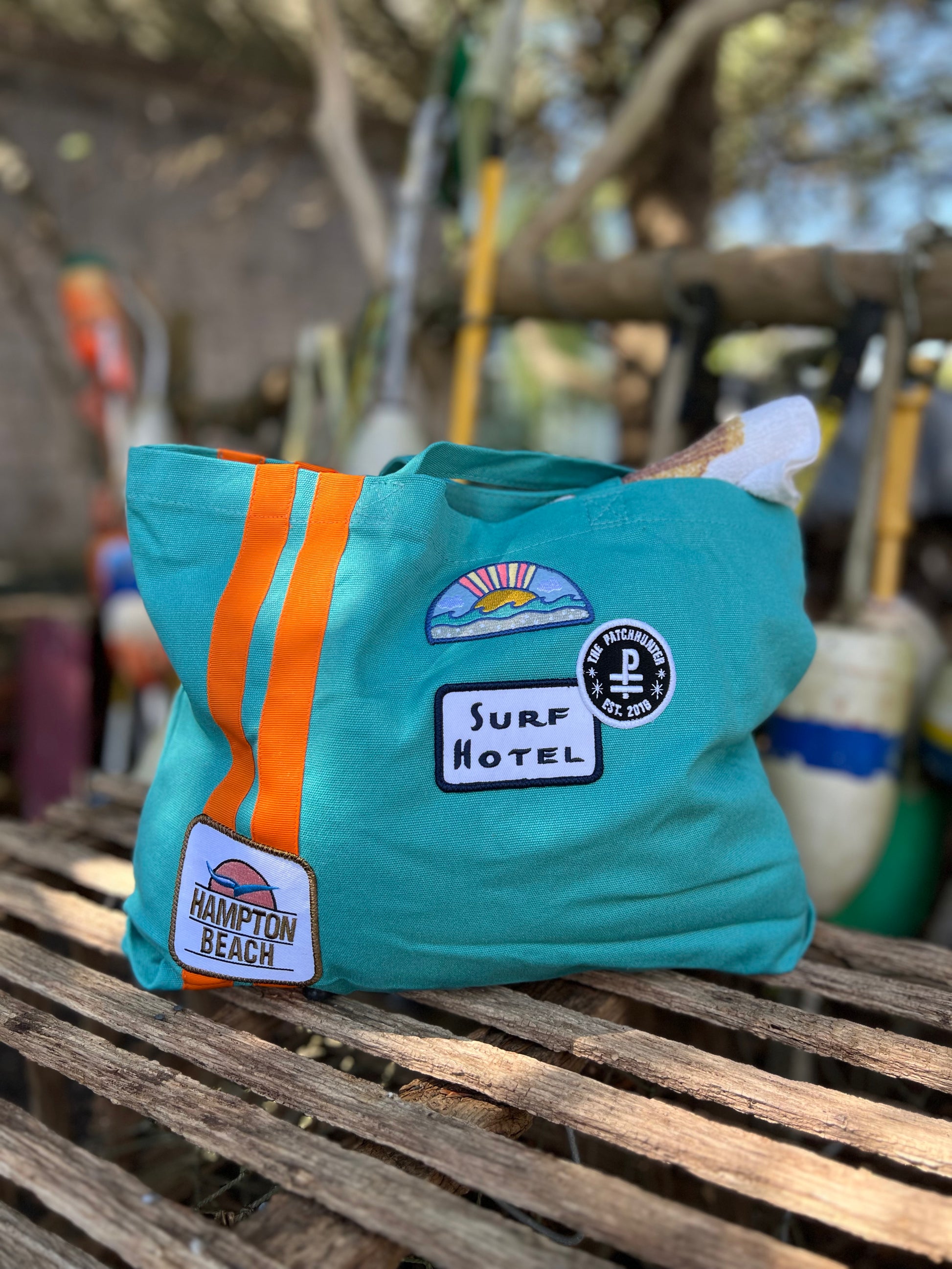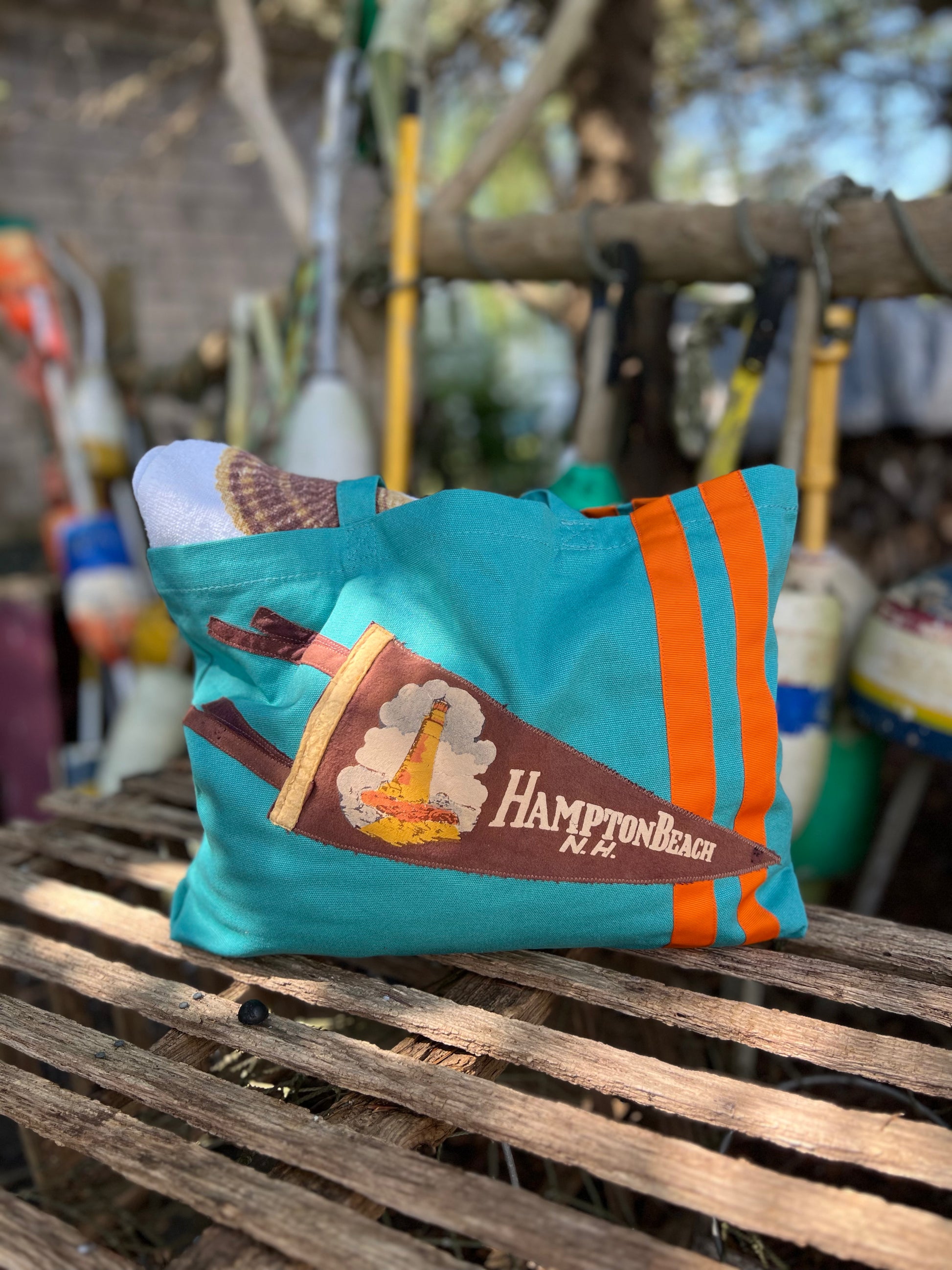 Tote bag created with authentic vintage Hampton Beach pennant and various other patches.
