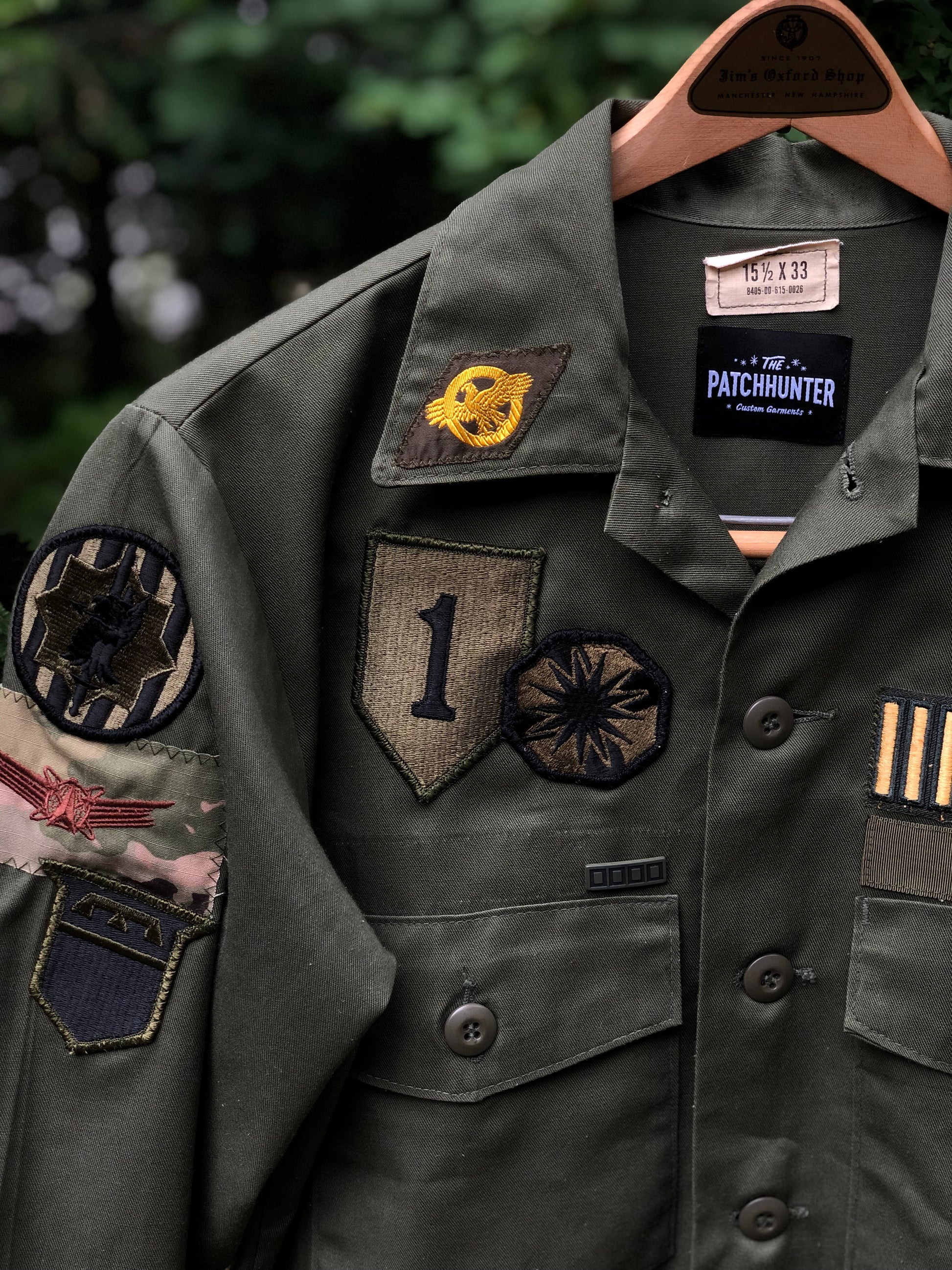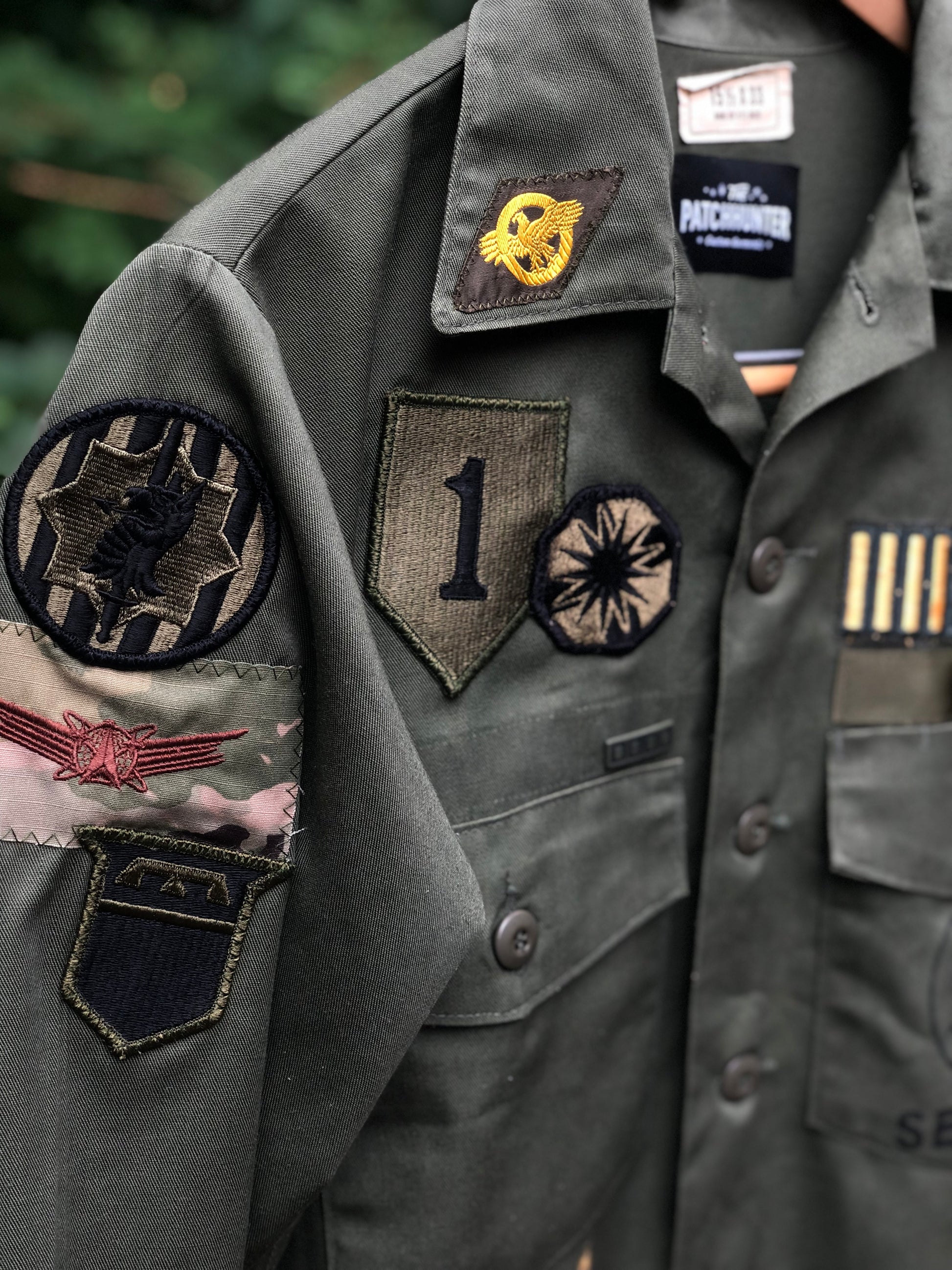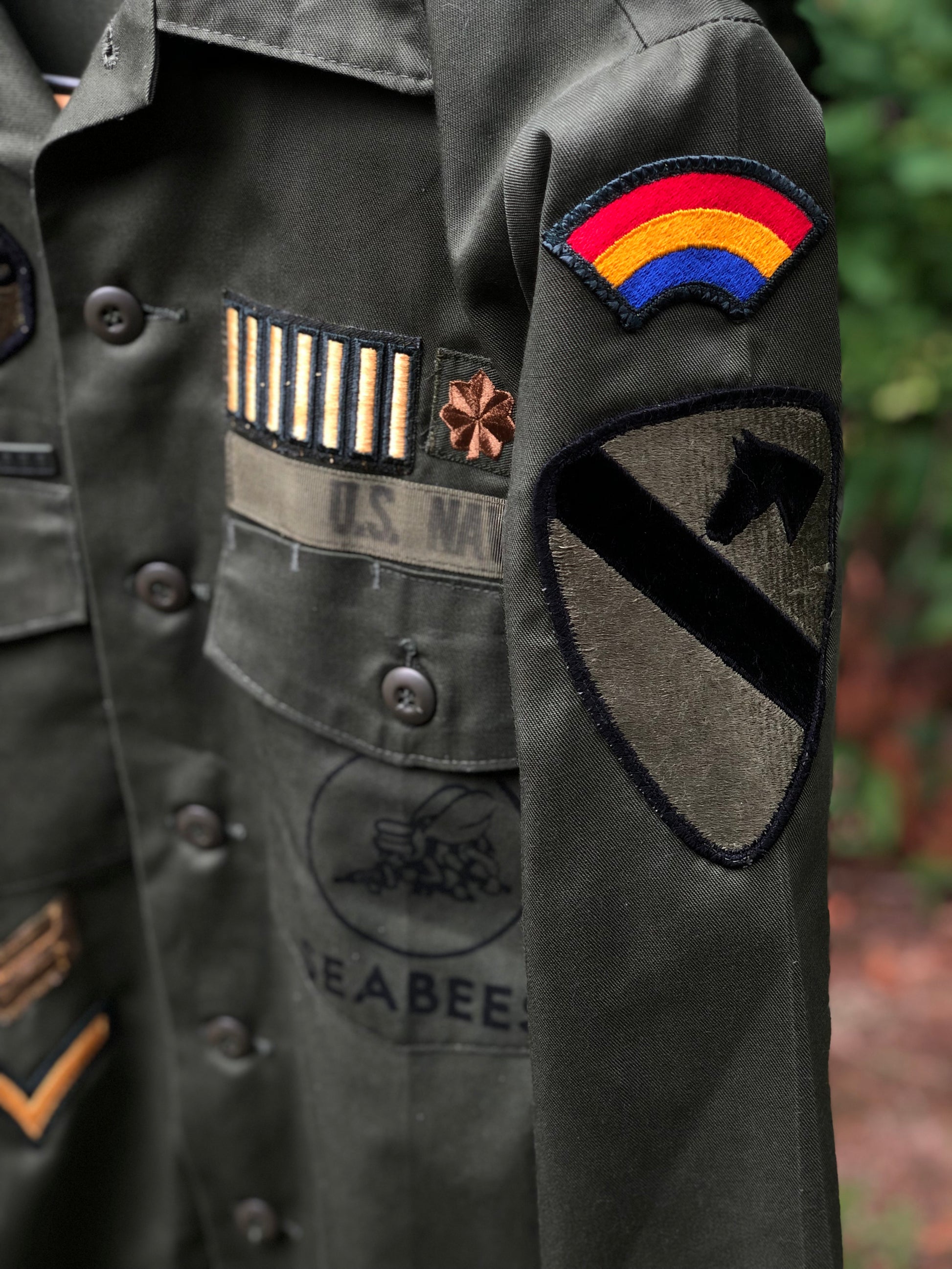 PH = Patchhunter orrrr Party Hour? Either way, this green monochromatic jack-shirt features 17 unique patches and U.S. Navy Seabees detail with original tags.