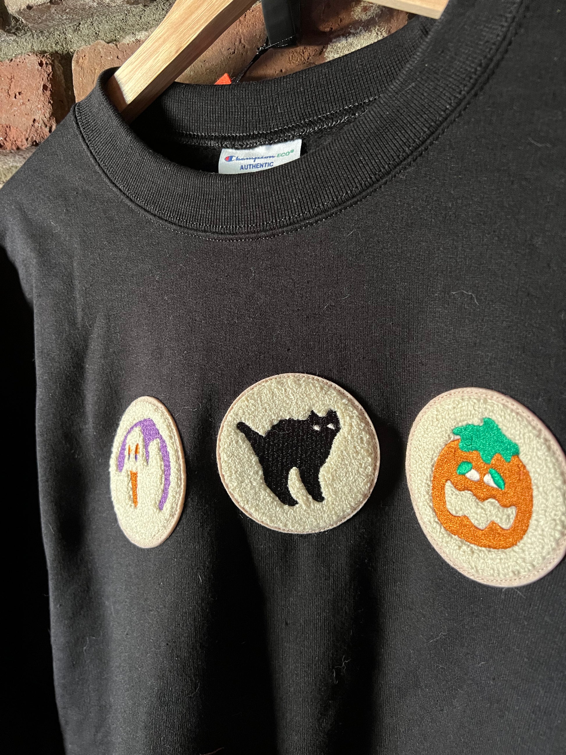 Represent your favorite seasonal cookie with this sweatshirt featuring three chenille patches of each Halloween design!