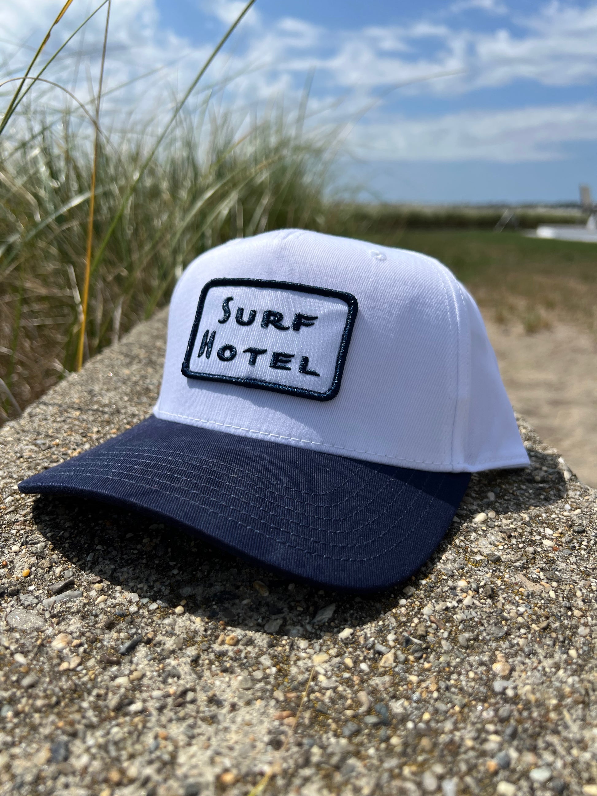 In February of 2010 a fire destroyed these "A block" businesses of Hampton Beach, including the famous 15 room, Surf Hotel. Carry on the legend with this hat desiggned in the style of their old sign.