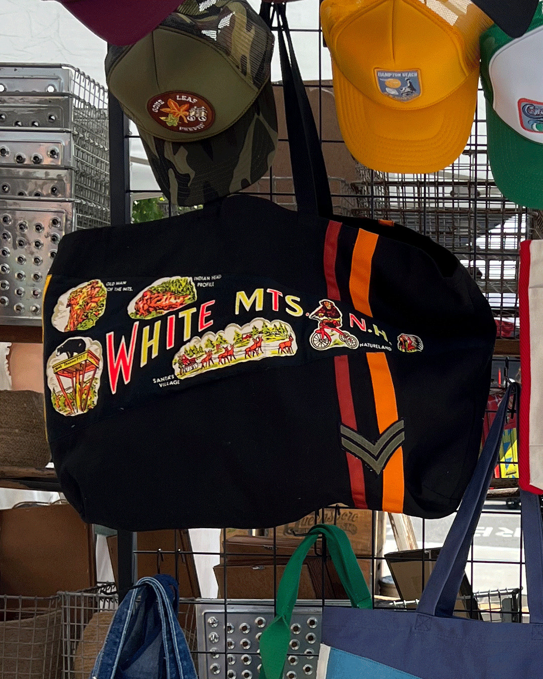 A black tote bag created with authentic vintage White Mountains, NH pennant and various other patches.